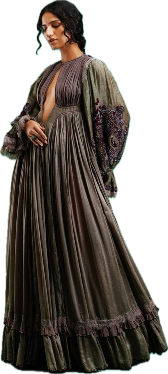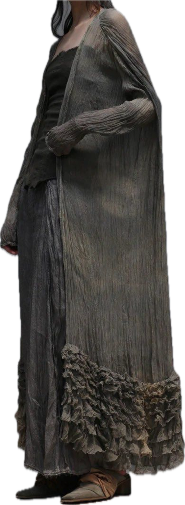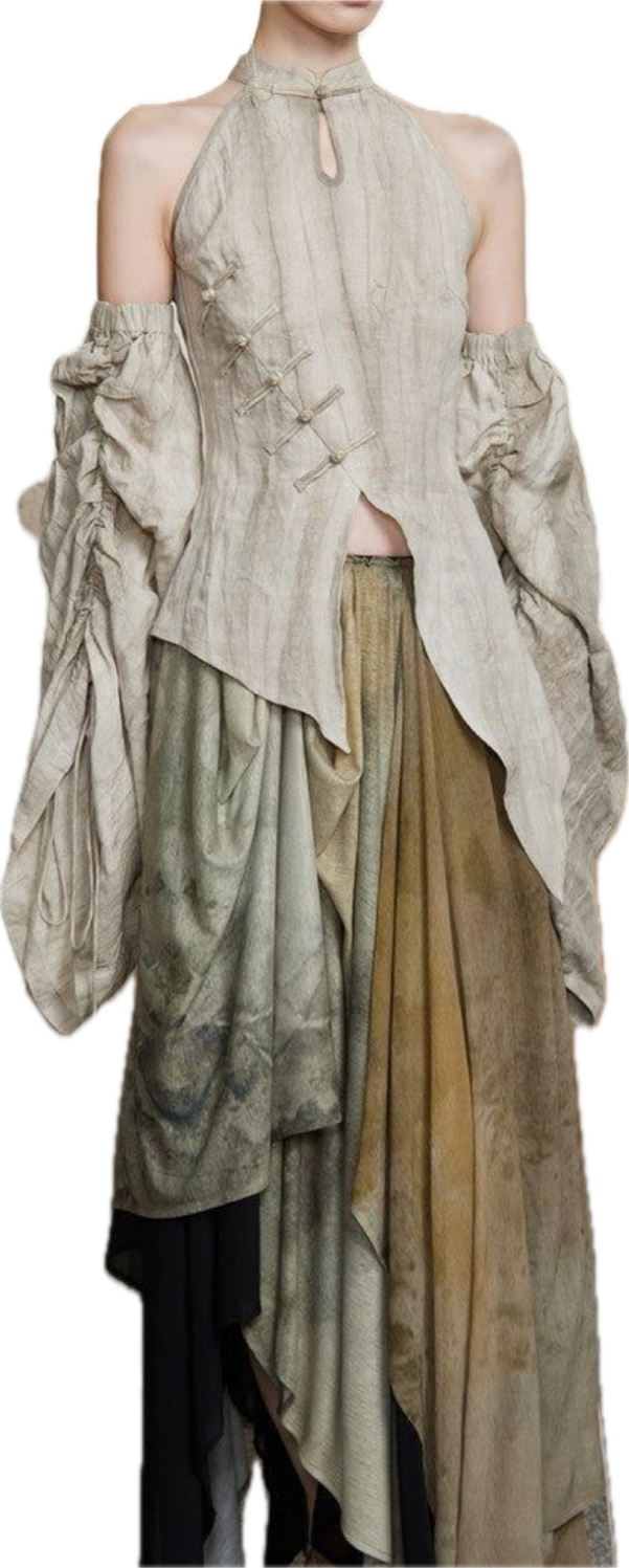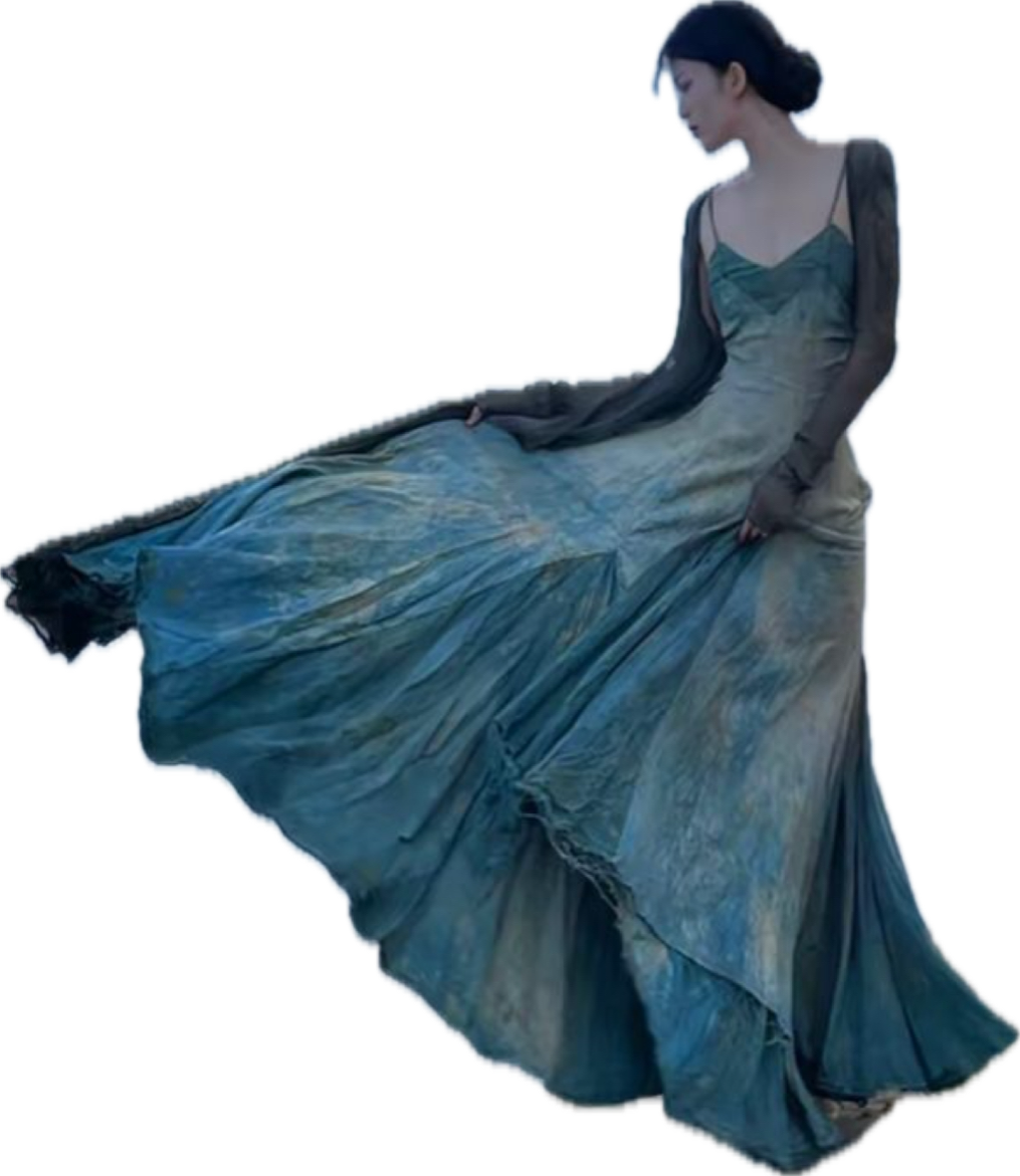 Dress as something the rain would reveal. Think textures that feel born from earth after a storm: mossy greens, mist-washed silks, raw organic fibers, and garments with movement like drifting clouds or rising steam. Layered sheers, weathered neutrals, soft metallics, and shapes that echo erosion, bloom, or rainfall.